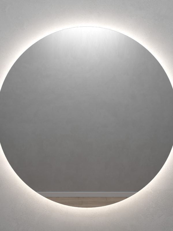 Безрамное зеркало круглой формы с контурной (тыльной) нейтральной подсветкой, свет 4000К. Подложка из высококачественного МДФ, светодиодная лента защищена матовым свето-рассеивателем от попадания пыли и влаги. Есть вывод 220W для подключения к сети, включение подсветки от выключателя на стене, либо от розетки.